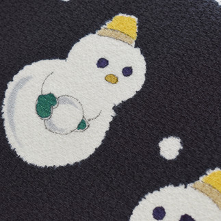 凹凸のある生地で、雪のふんわり感が表現されています。地色は紺とグレーの中間を濃くしたような色で、白い雪だるまが映えます。